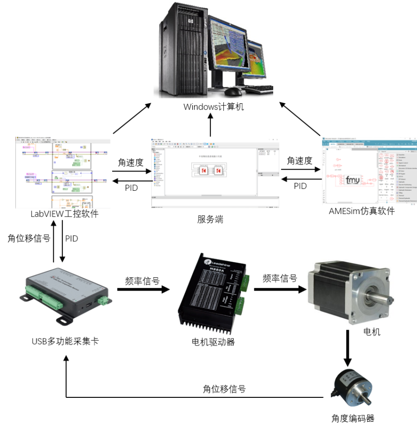 电机速度闭环控制半物理仿����� �������Ƴ������������ �������Ƴ������������ �������Ƴ������������ �������Ƴ�������真采用AMESim与LabVIEW����� �������Ƴ������������ �������Ƴ������������ �������Ƴ������������ �������Ƴ�������联合仿真来实现,通过PID速����� �������Ƴ������������ �������Ƴ������������ �������Ƴ������������ �������Ƴ�������度闭环控制来阐述仿真原理。在AMESim中发����� �������Ƴ������������ �������Ƴ������������ �������Ƴ������������ �������Ƴ�������送转速信号,与LabVIEW工控软件采集的角度����� �������Ƴ������������ �������Ƴ������������ �������Ƴ������������ �������Ƴ�������编码器转速信号形成负反馈,利用PID调节����� �������Ƴ������������ �������Ƴ����������� �������Ƴ������������ �������Ƴ�������之后通过服务端中转将PID控制信号发送至L����� �������Ƴ������������ �������Ƴ������������ �������Ƴ������������ �������Ƴ�������abVIEW工控软件,再由LabVIEW工控软����� �������Ƴ������������ �������Ƴ����������� �������Ƴ������������ �������Ƴ�������件发送PID信号控制电机����� �������Ƴ������������ �������Ƴ������������ �������Ƴ������������ �������Ƴ�������按指令要求工作。
