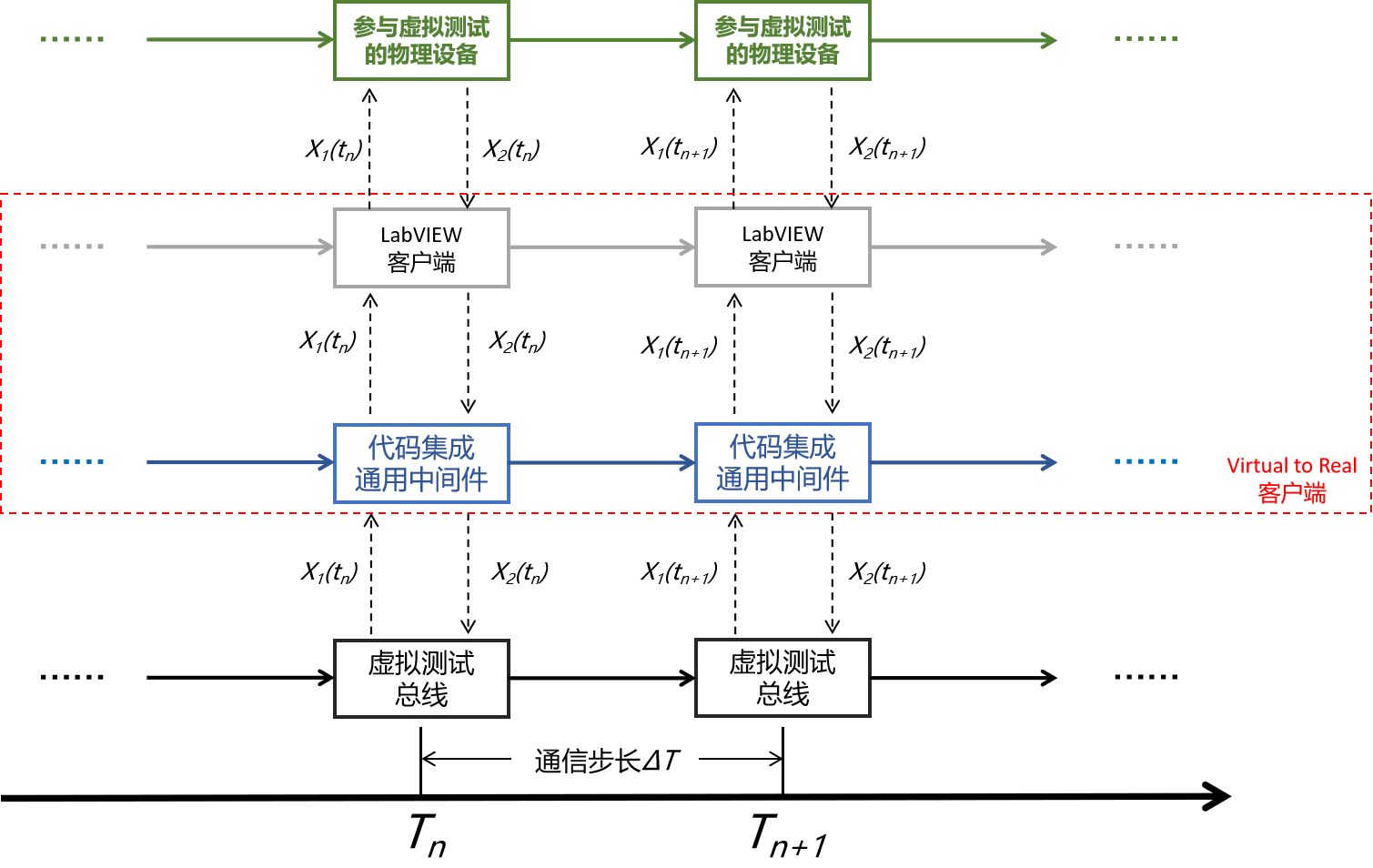 本试验中的虚实融合主要通过虚实客户端来实现,即V����� �������Ƴ����������� �������Ƴ����������� �������Ƴ������������ �������Ƴ�������2R(Virtual to ����� �������Ƴ������������ �������Ƴ������������ �������Ƴ����������� �������Ƴ������Real)。V2R可以理解为����� �������Ƴ������������ �������Ƴ������������ �������Ƴ������������ �������Ƴ�������一类软件形式的中间件,其作用是负责����� �������Ƴ������������ �������Ƴ����������� �������Ƴ������������ �������Ƴ�������将实物设备和仿真模型接入总线,并实现����� �������Ƴ����������� �������Ƴ������������ �������Ƴ������������ �������Ƴ�������数据分发、模型间互操作和同步控制。����� �������Ƴ����������� �������Ƴ������������ �������Ƴ������������ �������Ƴ�������本次试验中,V2R是通过LabVIEW实����� �������Ƴ������������ �������Ƴ������������ �������Ƴ������������ �������Ƴ�������现的,其作用是连接分布式����� �������Ƴ������������ �������Ƴ������������ �������Ƴ������������ �������Ƴ�������服务端和数据采集板卡。