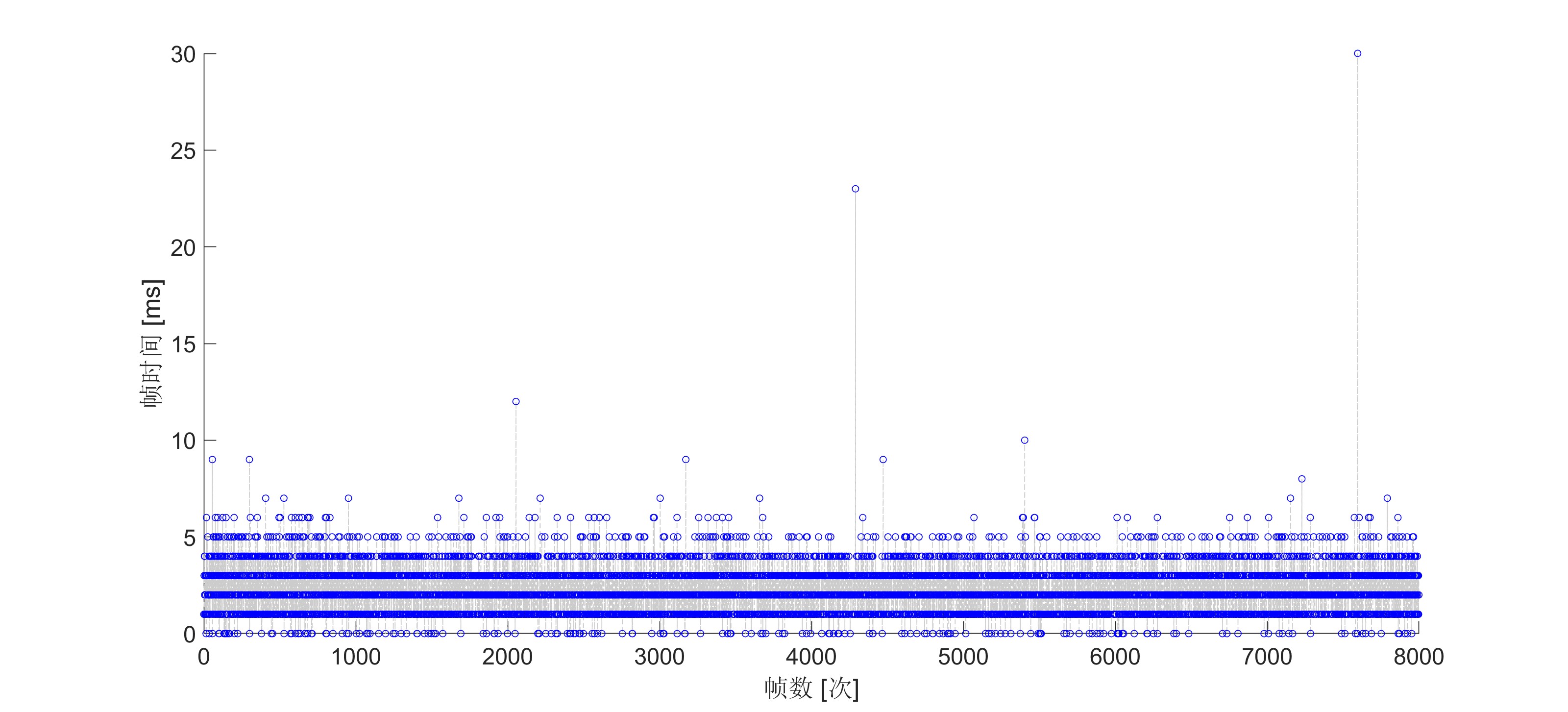 本次试验的通信步长为0.01s,所以运行80s,����� �������Ƴ����������� �������Ƴ������������ �������Ƴ������������ �������Ƴ�������共计8000帧。整体来说该����� �������Ƴ������������ �������Ƴ������������ �������Ƴ����������� �������Ƴ�������系统实时性较好。同时,根据统计结果可知,较大的帧����� �������Ƴ������������ �������Ƴ������������ �������Ƴ������������ �������Ƴ�������时间出现了3次,分别是12m����� �������Ƴ������������ �������Ƴ������������ �������Ƴ����������� �������Ƴ�������s、23ms和30ms。这三����� �������Ƴ������������ �������Ƴ������������ �������Ƴ������������ �������Ƴ�������帧超出了硬实时的要求(耗时大于0.01s),其����� �������Ƴ������������ �������Ƴ������������ �������Ƴ������������ �������Ƴ�������余帧数均满足硬实时的要求,整体����� �������Ƴ������������ �������Ƴ����������� �������Ƴ������������ �������Ƴ�������满足软实时的要求。